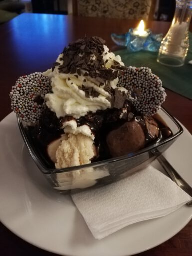Apfelstreusel, Vanilleeis und heiße Schokolade mit Sahne